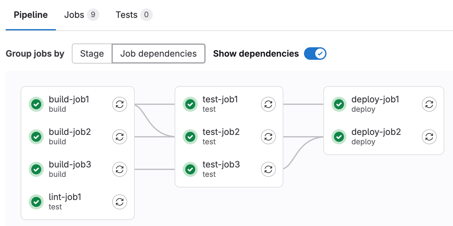 lint-job配置为needs: []且不依赖任何 jobs,因此显示在第一列,尽管它属于test阶段。test-job1依赖build-job1,test-job2依赖build-job1和build-job2,因此两个测试 jobs 显示在第二列。- 两个