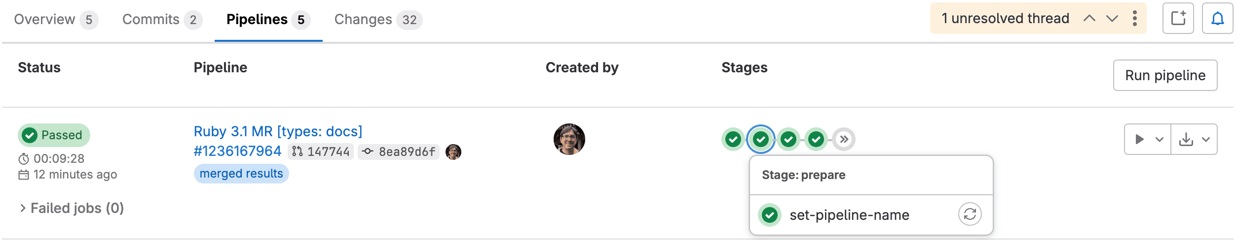 要查看与特定合并请求相关的流水线,请转到合并请求的 Pipelines 标签页。