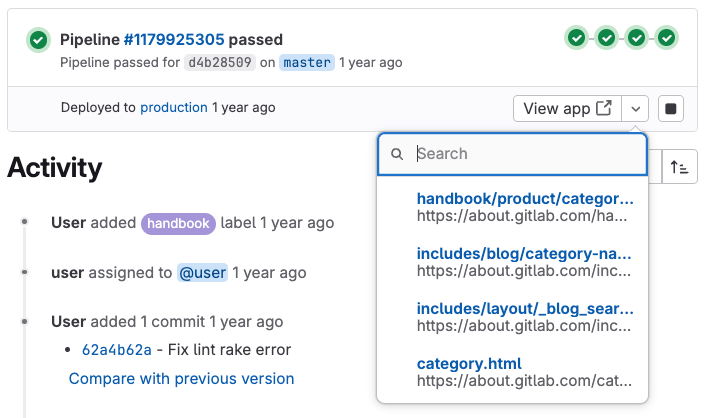1. 在合并请求小部件中,选择「查看应用」。 下拉列表显示最多5个映射页面(如果更多可用则提供筛选)。