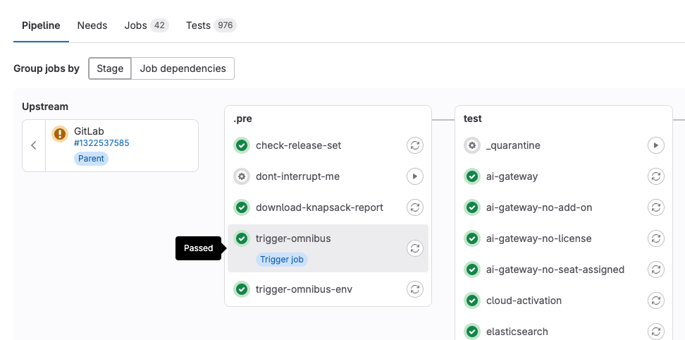 当你向 GitLab CE 或 GitLab EE 项目推送 commit 时,该 commit 的管道将在 .pre 阶段的 e2e:test-on-omnibus-ee 子管道中包含一个 trigger-omnibus 作业。