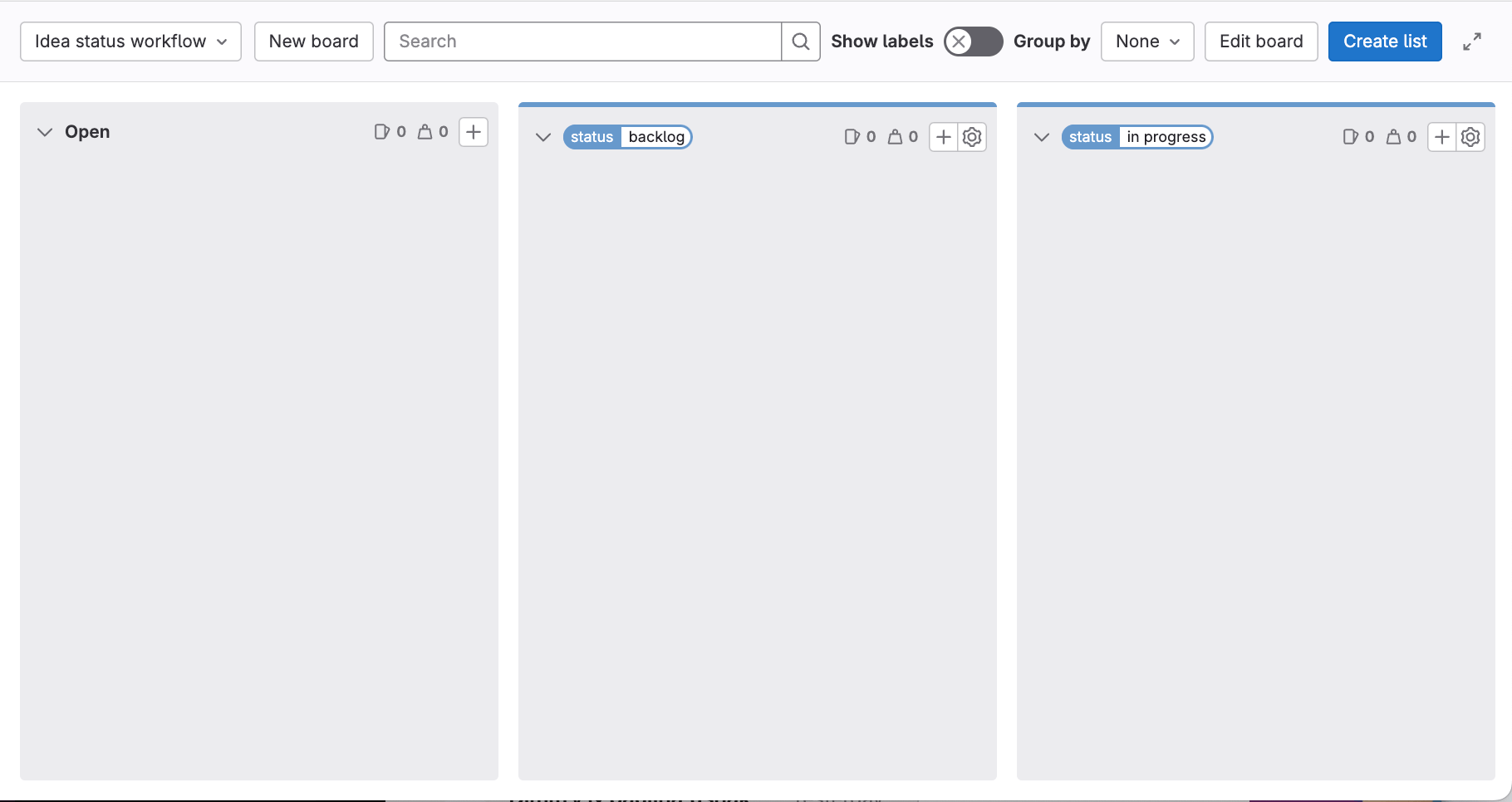 为准备接收想法,创建一个按标签组织想法的 issue 看板。 您将使用它通过将卡片拖动到各个列表来快速创建 issue 并为其添加标签。