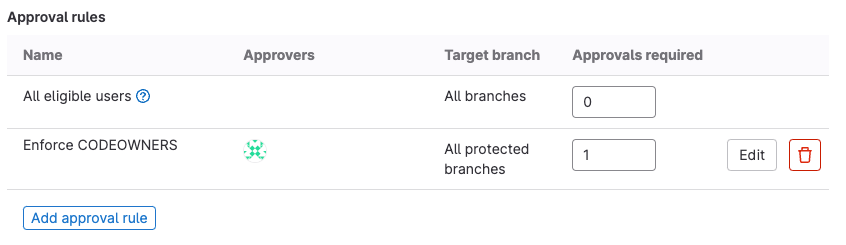 CODEOWNERS 文件描述了目录和文件类型的适当审查者。审批规则将合并请求引导到这些审查者。在这里,您将设置一个使用新 CODEOWNERS 文件信息并为发布分支添加保护的审批规则:
