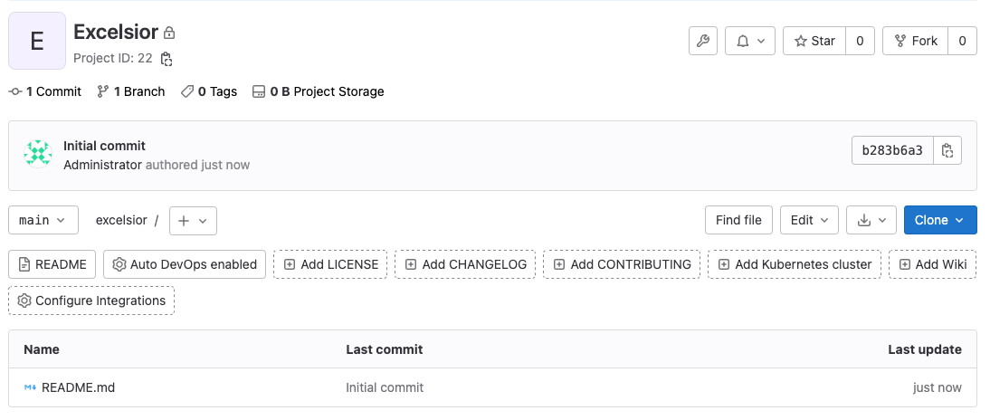 GitLab 为您创建 excelsior 项目,并将您重定向到其主页。它应该看起来像这样:
