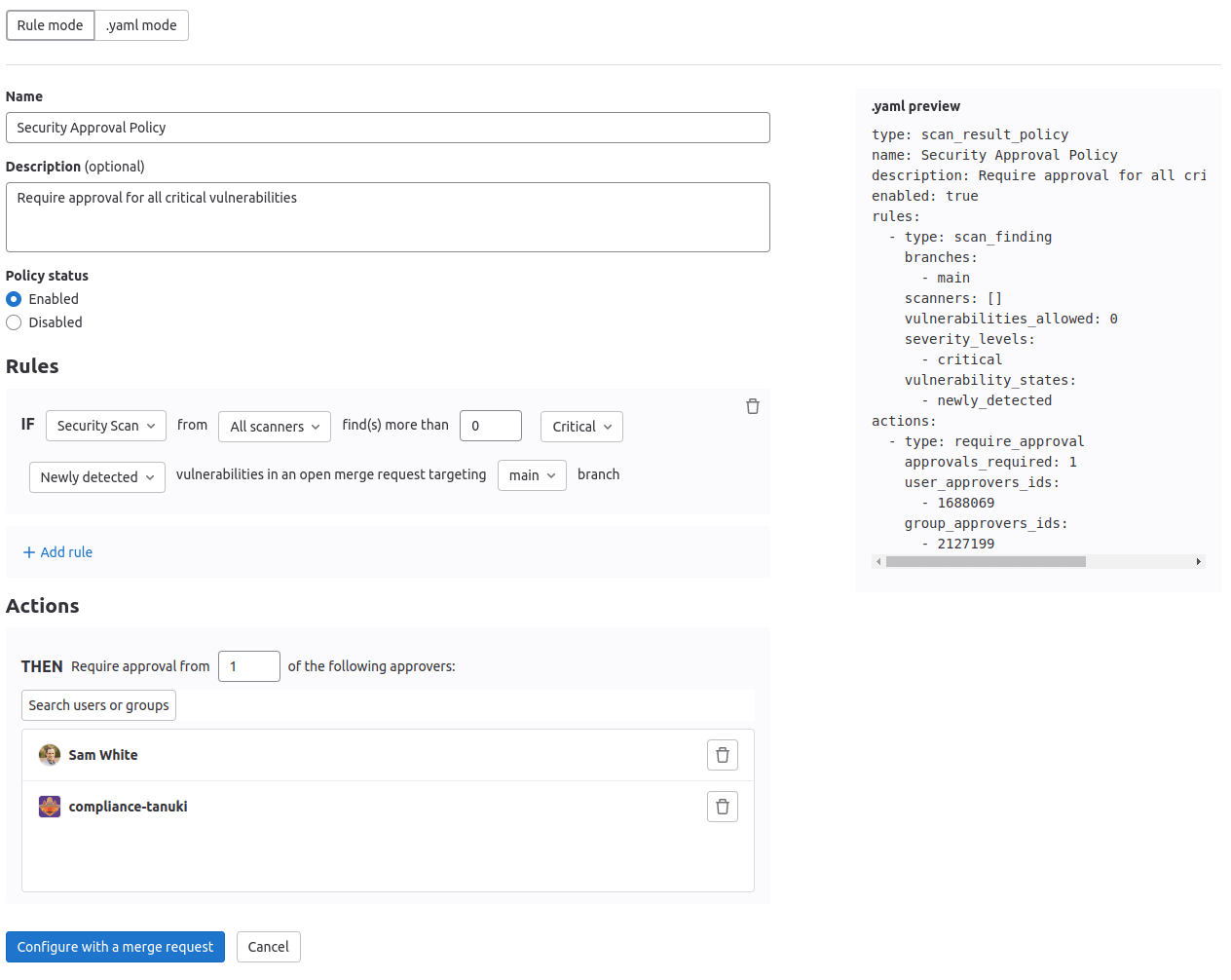 - 在您的安全策略项目中设置合并请求审批规则,要求指定审批人进行审查。